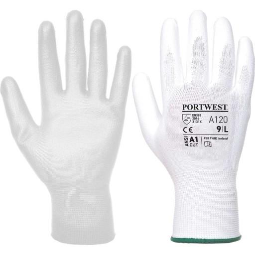 Slidstærke arbejdshandsker til præcisionsopgaver Her får du et par hvide arbejdshandsker, der er perfekte til dig, der arbejder med både grove og mere nøjagtige opgaver. Handskerne er lavet i polyester og polyuretan, hvilket gør dem både fleksible og hold