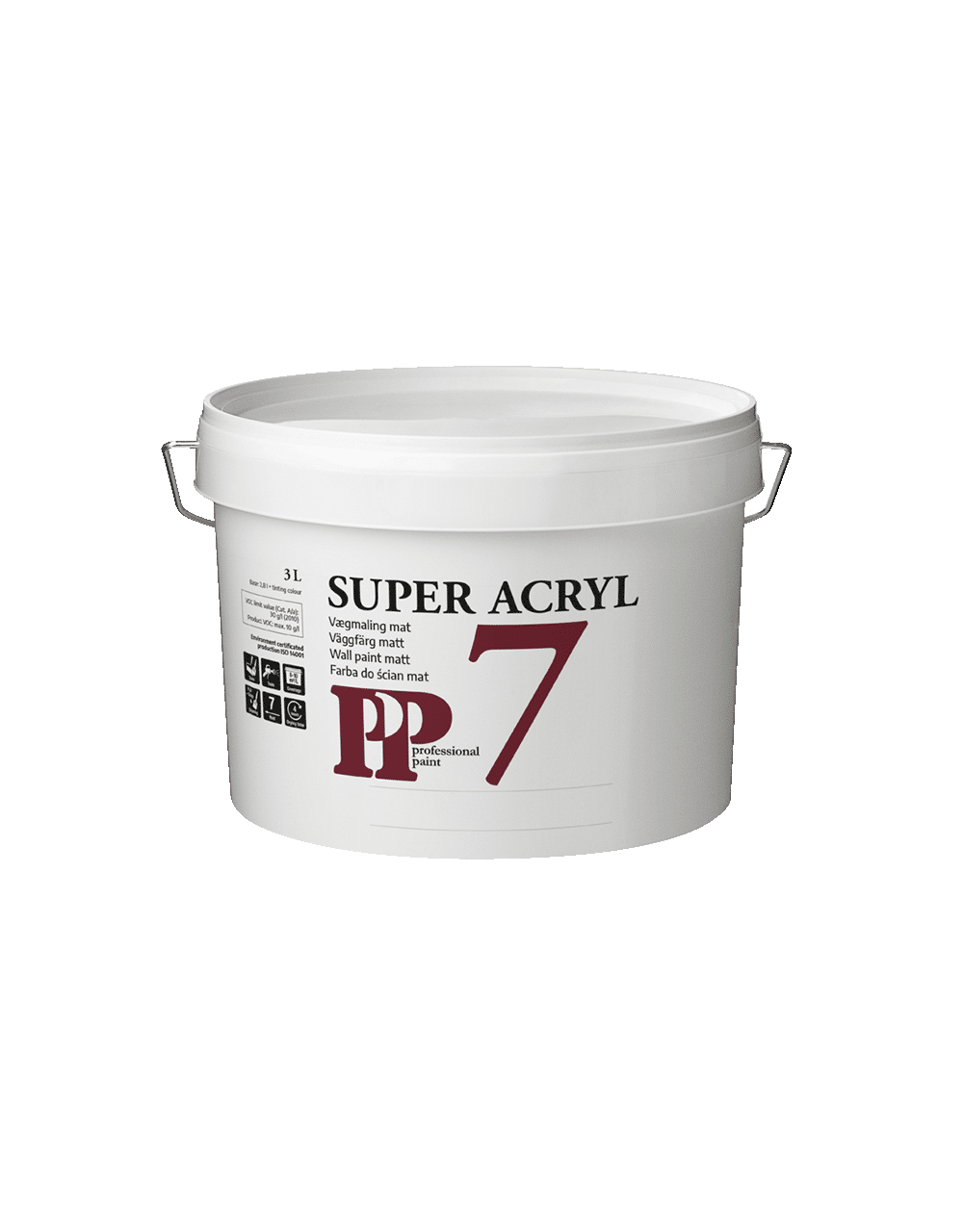PP Super Acryl 7 fra Professional Paint er en acryl-vægmaling i høj kvalitet, der er udviklet til at give et ensartet og mat resultat med en diskret glans. Malingen er særligt populær til brug i stuer, værelser og kontorer, da den sikrer en robust overflade, som tåler hverdagens brug og lettere rengøring. Takket være den gode fyldighed og dækkeevne er den effektiv at arbejde med for både professionelle og private.